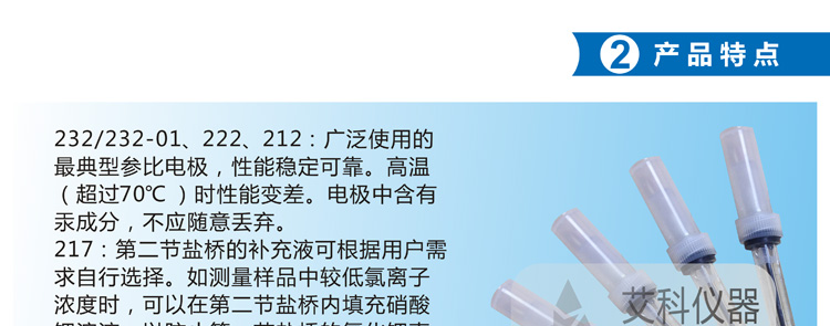 232/232-01、222、212:廣泛使用的**典型參比電極,性能穩(wěn)定可靠。高溫(超過70℃)時性能變差。電極中含有汞成分,不應(yīng)隨意丟棄。