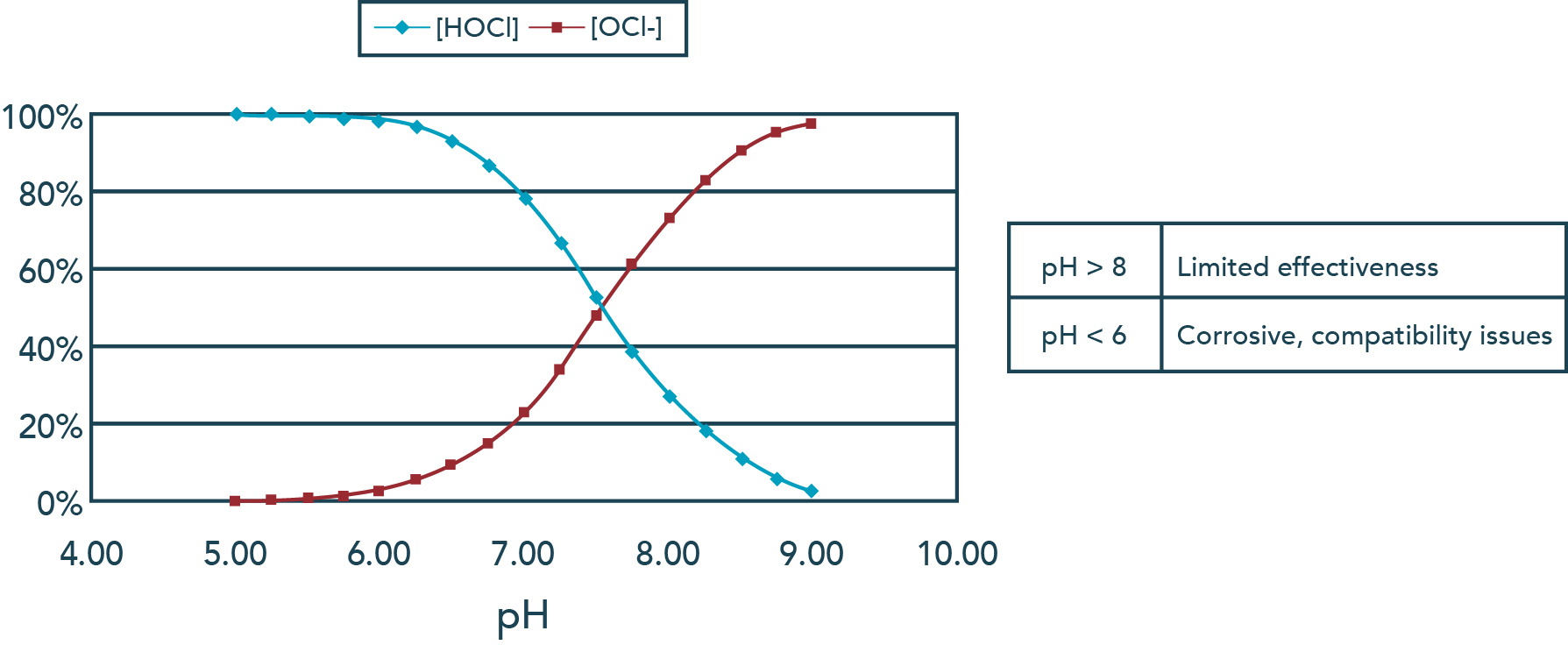 氯可以作為游離氯或氯胺存在。兩組都可以氧化化合物并實現治療目標,但是,需要更多的氯胺來滿足相同的氯需求。游離氯測量分別考慮水中的離子形式和質子化形式的氯,OCl-和HOCl。在這兩者中,HOCl(次氯酸)是更強的氧化劑,并且在7.5的pH下是主要的。